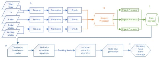 Figure 2 depicts an overview of the implemented data flow. In the architecture, data collection starts upon their creation while monitoring several news feeds for events (A). An extensive effort was put into multi-source event gathering from (a) websites through data scraping and indexing, (b) written press such as newspapers through digitization and indexing, and (c) social media, television, and traditional radio through transcription, which is currently carried out by a news provider collaborator with the use of custom speech-to-text tools. News extracted by TV and radio is considered especially important. Many events may be firstly broadcast by these traditional media, as they still have faster access to specific news agencies. Each event is described as a single and independent data message, generated by a news feed. Such a data message, e.g., an article or a Twitter tweet, may imply one or multiple events, but in terms of news coverage, this can be considered as a single event requiring journalistic action. This initial process produces events to be propagated to the system after being enriched with additional information that allows categorization and management that will subsequently help to effectively query for events. Events enter the system utilizing a common bus (B), a communication channel that serves the purpose of conveying information while, at the same time, ensuring data integrity and avoiding data redundancy (buffered process). It can store data in an intermediate state for a specified amount of time that can range from minutes to several days. Events that exit the common channel are stored in a database (C) in a structured way that enables fast indexing and retrieval. Events are retrieved (D) as sets of filtered information for specified time windows/ranges and checked for correlation using a multi-step detection algorithm. The output is a number of real events, along with their statistics, marked as breaking news. For a drone to be able to interconnect with such a system and operate, geographical information is needed. This information is extracted using a separate, multi-stage algorithm (E) that takes into account location-related terms in the actual text of the event, as well as related imagery that can be retrieved from it. The system is integrated as a web application that can also accept UGC that enhances user experience.