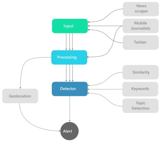 The framework consists of the modules shown in Figure 3, which outlines the conceptual architectural processes as described above. The innovation of this design lies in the ability of the system to continuously improve its performance, while also being able to handle each different input type independently by inserting new “pluggable” entities into the system (e.g., interaction with the devices of mobile journalists). Detailed information is given in the following subsections.