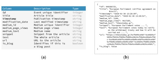 Events are organized as sets of fields, with each one containing specific data types and content. An event schema is presented in Figure 4, along with an example event (translated in English). This process is called normalization and is the cornerstone for the creation of a unified mechanism to execute analytics [45] against really large amounts of information. The final phase taking place is the enrichment process, which can be described as the action of adding artificial fields in the original event that would not normally exist. Internal content and articles’ metadata form useful information that feeds the implemented breaking news detection system. This data may include title and relevant keywords, media-related information, and time-, location-, and context-aware metadata, which in terms of NLP research community terminology are transformed to more solid and crisp representations, i.e., action, agents, place, time, etc. Despite the requirements that algorithms introduce, the events are uniformly presented in this form to also be able to propagate the input outside of this internal ecosystem. A crucial criterion behind the schema design is for it to be comprehensible by journalists that will need to process the accompanying information upon breaking news detection.