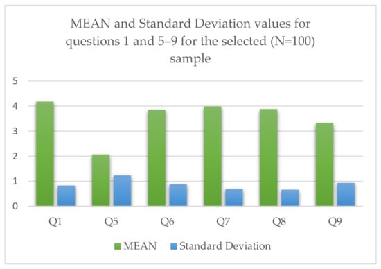 Out of 100 respondents, 27% are male and 73% are female. As far as the age groups to which the respondents belong, 58%, 31%, and 11% of them belong in the age group of 18–25, 26–40, and above 40, respectively. Most of the respondents’ roles (74%) are that of news consumers, while only 9% have a journalistic role (either as professional journalists or professionals in the broader mass communication field). In sum, 17% of the collected responses come from people that consider themselves as dynamic news consumers and/or distributors (via personal pages or blogs). Almost all of the respondents (99%) use the internet at least once a day, and 78% of them use the internet for news retrieval. Figure 5 below, also presents the MEAN and Standard Deviation values for questions Q1 and Q5 – Q9, according to the results discussed above.