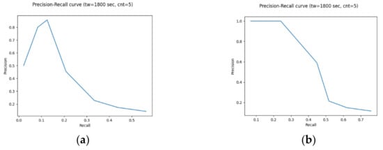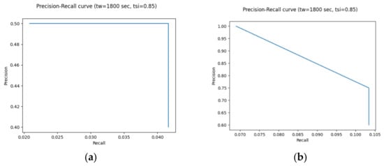 Precision–Recall curve keeping the window at 1800 s and the count threshold at 5 while increasing the similarity threshold from 0.55 to 1.0 with a step of 0.5: (a) three-vote unanimous set; (b) two-vote majority set.