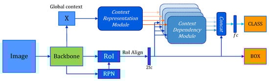 As a classic two-stage detector, Faster R-CNN [20] designs a novel Region Proposal Network (RPN) to generate rectangular proposals and promotes the emergence of follow-up works [22,23]. For instance, Feature Pyramid Network (FPN) [22] addresses multi-scale problems using feature pyramid representations. Mask R-CNN [24] proposes an RoIAlign layer to align the visual features of objects exactly. These methods improve the quality of local visual features while neglecting the context dependencies. As a complement to these works, we concentrate on capturing context dependencies to further enhance the local RoI feature representations.