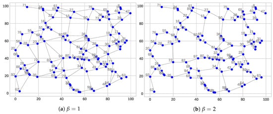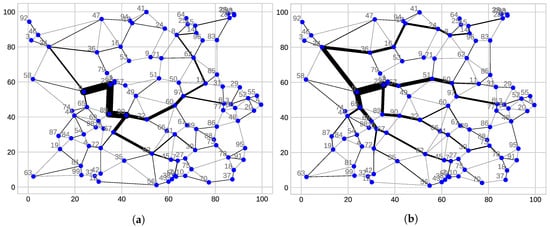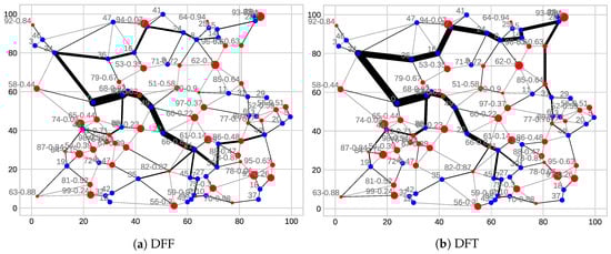 Figure 14 shows how the setting of the destination only flag influences construction of paths. Blue nodes have and red nodes have . The size of the red nodes grows with decreasing of their PDR value. The value of PDR is written next to the node ID. Paths in Figure 14 were constructed with the default configuration and Exponential Delay function with and . Grey links are not used. Links are thicker when they are used in more paths. DFF topology has longer paths and fewer branches because paths are built on existing ones (see Section 2.3.1).