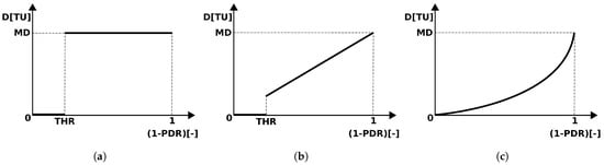 We consider three functions for delaying the RREQ messages depending on the node PDR. Each delay function input consists of the estimated PDR and some function parameters, and the output is the calculated delay D of the RREQ message in . Each function is described in detail in the following sections. The graphical representation of all functions is in Figure 2.