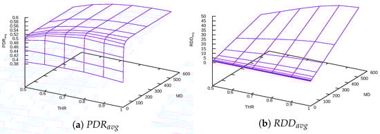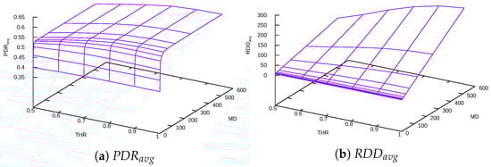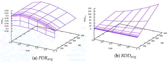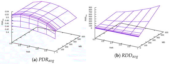 and metrics need to be minimized, contrary to the average , which needs to be maximized. Due to the delay function, improving the PDR means worsening PL and RDD. Greater MD value prolongs the path length and increases the route discovery time.