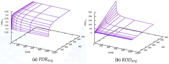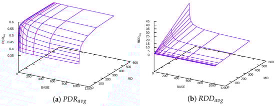 As with previous functions, greater MD increases , while using a greater BASE with the same MD helps reduce the delay but, at the same time, produces worse .