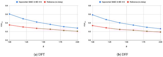 Performance metrics for Constant, Linear, and Exponential Delay functions with DFT vs. DFF are depicted on Figure 6 vs. Figure 7, Figure 8 vs. Figure 9, and Figure 10 vs. Figure 11, respectively. DFT allows to reach greater values of for the price of longer . values of DFT are by one order greater than the corresponding results of DFF (see Table 8, compare DFT and DFF sections).