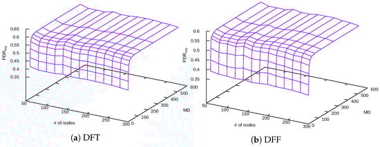 The importance of the parameter that determines the density of the network is shown in Figure 12 for the Exponential Delay function. In networks with greater and, therefore, smaller density, fewer alternative routes can be found, thus less space is left for improving . Models DFT and DFF differ marginally.