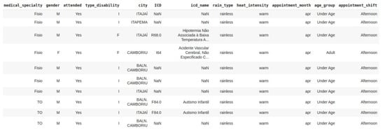 The expected value for the “Type of Disability” column was the letter “I” for intellectual disability and “F” for physical disability. However, we noticed that seven empty values, and three values outside the expected standard. In those cases, we amputated the empties values and corrected the others. Another validation of the data was related to the appointments date format. The initial data were not in the standard day/month/year. We provided the adjustment to this format. After this transformation, we considered only the data for 2019 and discarded the 90 medical records found for 2017.
