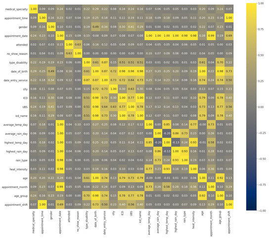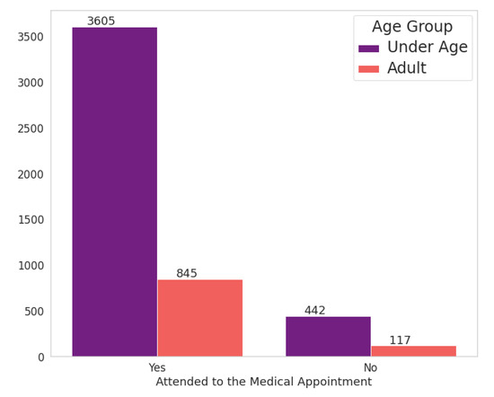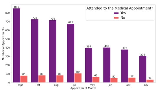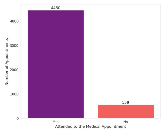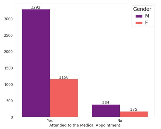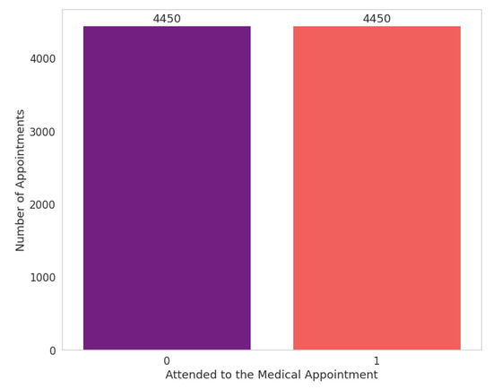25]. Firstly, we renamed the dataset columns. Secondly, we started the validation process. For the attribute “Attended”, we found that some values were in a different format than expected, such as “No”, “no”, and “Did not attend”. To deal with this inconsistency, we adjusted all values to the value “No” to standardize this attribute value—in this case, where the patient did not attend the scheduled appointment.