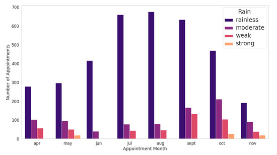 Figure 10, it is not possible to establish a direct relationship between the patient’s behaviour and their abstention from rain strength on the appointment day.