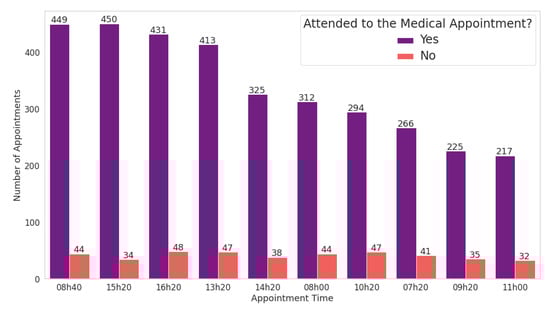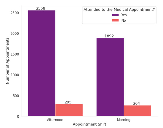 We extracted the appointment shifts based on the appointment time and divided them into “morning” and “afternoon” shifts. The morning shift refers to the period until midnight and the afternoon shift from this time on. Scheduled appointment times at the health centre range from 7 a.m. to 6:20 p.m. In the analyzed data, there are 35 different scheduled times; the time of 8:40 a.m. had the highest number of medical appointments.