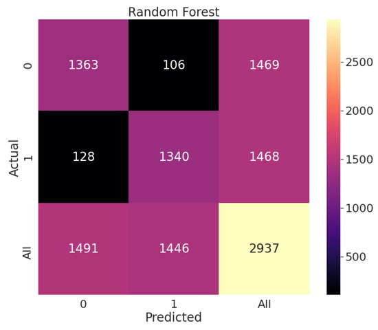 These results are acquired by drawing a confusion matrix for each classifier and then taking the average of the results. The confusion matrix enables visualization of the metrics, where the diagonal elements represent the number of points for which the predicted label is equal to the true label, while off-diagonal elements are those that are mislabelled by the classifier. After training all the three algorithms and fitting the Random Forest model with the test data, we obtained the confusion matrix shown in