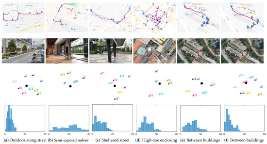 Preliminary studies on GNSS data. (a) Outdoor, long, wide street; (b) inside a glass building and on a void deck, (c) sheltered street; (d) enclosed, high-rise area; (e) building surrounded by street; and (f) the same as (e) but at a different time. We put ground-truth and GPS traces on Google Maps snapshots in the first row, the corresponding photographic views in the second, then satellite distribution patterns (with black dot indicating the position of receiver) in the third, and finally GPS error distributions (in meters) in the last.