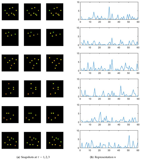 The encoder first applies a convolution layer with filter size to each and flattens it into a vector as an input for the GRU cell. At the decoder side, the semantic vector is set as the hidden state, the output generated by the RNN is reshaped, and a deconvolutional layer applied, with the same filter size as applied at the encoder side to obtain the final output . The parameters setting for , ℓ and will be studied in Section 5.2.1. Figure 2 shows examples of snapshots and correspondingly generated representations, based on the six scenarios in Figure 1. Due to space limitations, we only visualize the first three steps in a sequence of length five, and select three features to be the RGB channels of images.