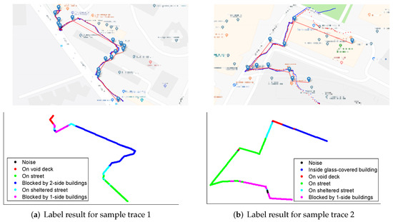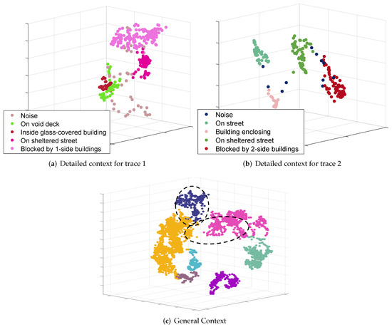 - Lower-level clustering: For a set of representations, we use DBSCAN to cluster them into small clusters, assign each cluster with a predefined label as the detailed context and calculate the center of the cluster. Detected noise is labeled as “noise”. Lower-level clustering captures scenario information, such as “on street”, “blocked one one side by building”, “building enclosing”, and “on void deck”. Figure 4a,b demonstrate two traces after lower-level clustering.
