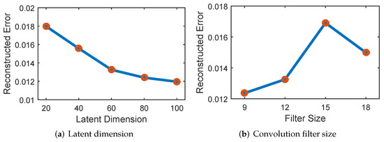 As presented in Section 4.2, there are three groups of hyperparameters to be determined: (i) input sequence steps for the sequence-to-sequence model; (ii) a latent dimension for the RNN GRU cells; and (iii) the filter size for the convolutional layer. The number of time steps is set it to five, thus, the model includes measurements from past 5 s. We set such a relatively small number as we intend to make the context relatively stable within the period so that the resulted representation can be better characterized as a stable context. As the loss for our model is the reconstruction error, we evaluate the effect of these parameters through reconstruction error, as shown in Figure 5. The latent dimension directly affects the dimension of our representation; there is a trade-off in determining the kernel number. On one hand, a larger latent dimension allows representations to encode more information. On the other hand, a larger latent dimension brings additional storage costs, model training, and application, at later stage. To achieve a balance, we select 60 when the error begins to gradually drop. We set the convolutional filter size as (12,12) so that each patch can capture a sufficient image while achieving acceptable reconstruction performance. We apply an Adam Optimizer and a ReLU activation function during the training procedure.