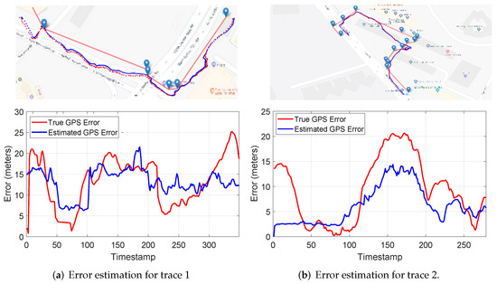 To further evaluate the performance of our representation in estimating GPS error, we compare it with the error estimates provided by the Android system. Instead of an absolute estimated error range, both the Android system [37] and Google [38] (yes, they are different APIs) provide an indicator called horizontal accuracy, defined as the radius of 68% confidence. In other words, there is a 68% probability that the true location is inside the circle centered at the reported location, with a radius indicating accuracy. To make our results comparable with it, we transform our absolute estimated error into a similar “accuracy indicator” by obtaining the 68% percentile over the error distribution within the preceding 10 s.