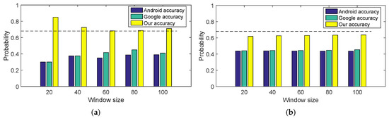 Based on the derived “accuracy indicator” for our model and the “horizontal accuracy” from the Android system, we compute the probability that the true GPS error is smaller than each accuracy range within a sliding window. A probability close to 68% implies an adequate accuracy indicator for localization performance, and one larger than 68% implies an over-conservative estimation, while one smaller than 68% implies an over-confident estimation. We also measure the probability with different sliding window sizes. Figure 8 reports the mean and median probabilities over all testing trips for different sliding window sizes, and it makes a comparison among accuracy indicators derived from our model, Android [37], and Google [38]. All models give a relatively stable median probability and mean probability over different window sizes, indicating that the estimators perform in a consistent manner. However, the indicator delivered by our model remains, almost always, around 68%, while the other two indicators always give over-confident estimations. This suggests that our model yields a more reliable location accuracy indicator, as compared with the other two systems.