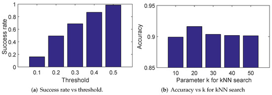 At the query phase, we conduct a top-down search within our context database. We assign each representation the same detailed context label of its k nearest neighbors, using cosine distance as a metric. If the nearest distance is larger than our predefined threshold, we record it as a “failure case”. We manually examine the assigned labels based on their corresponding locations for validation. As shown in Figure 9, we firstly evaluate the success rate given different thresholds. The success rate of queries increases when the threshold increases, and a threshold of 0.5 can cover 98.6% of queries. We then evaluate classification accuracy under threshold of 0.5 for different k values, and achieve the highest classification accuracy of 91.62% when ; the accuracies at different k values are all above 90%. The results show that our model can successfully recognize most contexts given a sufficient and well-labelled database.