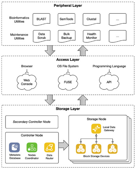 However, the file system, as well as the efficient analysis software, is crucial for maximizing the value of big data. Compared to the analysis research and their relevant tools development, the underlying file system on which the raw datasets and analysis results are stored has seldom been studied and customized to fulfill the special requirements of biology. Currently, researchers mainly use two kinds of file systems to manage their biology data [5,6]: local file systems and distributed file systems. For personal or small lab usage, a local file system constructed by several local storage devices is a convenient solution, such as Ext4 (https://ext4.wiki.kernel.org/ (accessed on 21 September 2022)), XFS (http://xfs.org/ (accessed on 21 September 2022)), etc. The major disadvantages of local file systems are their limitation of overall storage capacity and low scalability, since the number of usable disks is constrained by local computers and once the local file system is set up and formatted, it is not easy to add more disks to the original file system. For the demand of a robust file system with better performance for big data, a more popular solution is the generic distributed file system [7], such as GlusterFS (https://github.com/gluster/glusterfs (accessed on 21 September 2022)), CephFS (https://docs.ceph.com/ (accessed on 21 September 2022)), etc. A distributed file system is usually constructed by connecting disks installed in multiple server nodes together, so the capacity and scalability is no longer a problem, however the network communication overhead decreases the speed and latency of read/write operations.