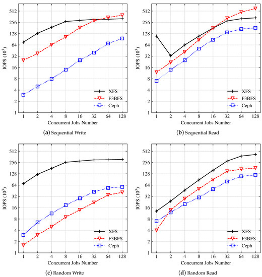 Figure 4 shows the IOPS of three file systems with a different number of concurrent tasks being executed. With a small number of concurrent jobs, the local file system XFS always performs the best, since it only requires one disk and thus its main performance bottleneck is the local disk IOPS. The sequential reading IOPS of XFS drops dramatically with the number of clients increasing to 2, most likely due to the built-in DRAM buffer of SSD and its prefetch cache technique. If the firmware receives a sequential read workload request, it will prefetch the subsequent data blocks into its DRAM as cache. This evaluation result is also reported by other work [29].
