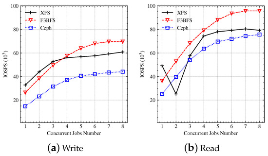 The Ceph and F3BFS clusters in our experiment are all composed of six nodes and one client node each. For XFS, only one node is allocated and only one 4 GB HDD is used. The storage engine of Ceph in this case is BlueStore, and the messenger type is async + posix. Since the Ceph file system does not not support RDMA, it has to be configured to use the TCP/IP network stack.