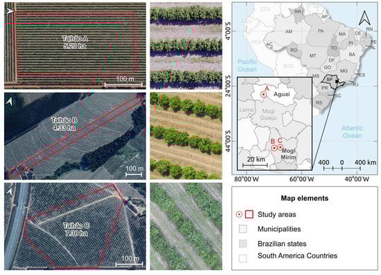 Figure 1) is composed of three fractions of plots located in São Paulo State, Brazil, referred as plots A (47.1285° W, 22.0543° S), B (47.0491° W, 22.4555° S) and C (47.0003° W, 22.4508° S). These plots cover 5.20, 4.33, 7.38 hectares, respectively, totaling 16.9 ha of orange plantations of Hamlin, Baianinha, Valencia, Pêra, and Natal varieties. Altogether, the segments of plots cover 9064 trees and have different spatial characteristics, such as planting age, crown height and diameter, spacing between trees and rows, as well as different soil coverage.
