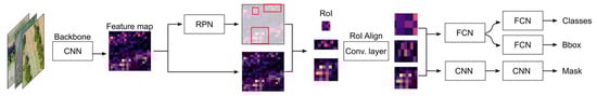 19]. Due to the different sizes and proportions considered for the RoIs, the algorithm performs a homogenization of its sizes, through a convolution layer called RoI-align. RoIs with the same size and scale are used as input in three different processes: (1) the softmax classifier preceded by a Fully Connected Network (FNC) that indicates the class and respective probability of each identified object; (2) the boundary box regressor preceded by an FCN for delimitation of the object’s bounding box; and (3) according to the increment of the Faster R-CNN by the Mask R-CNN, the delimitation of the object’s mask, at pixel level, through convolution layers [