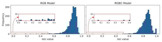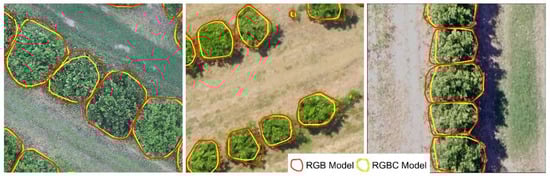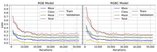 The models were not randomly started during the training process. Both networks were loaded with pre-training parameters of the COCO dataset. However, the parameters loaded correspond to pre-training on RGB images and because the RGBC model is executed with 4-band images, the weights of the first layer for this model were started randomly. Additionally, data augmentation was randomly applied to the training images prior to their entry into the models, and the changes applied to each of the samples correspond to one or two of the following transformations: (1) horizontal mirroring, (2) vertical mirroring, (3) rotation by 90°, 180°, or 270°, and (4) change in the brightness value of pixels in the interval between 50% and 150%.