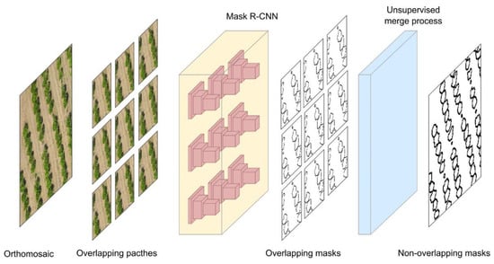 The development of this algorithm allowed for the adoption of a unified and automated framework, including all the segmentation procedures of the two previously trained models, which receive as input the ortho-mosaics and the CHMs from pre-processing and the output is the vector data corresponding to the delimitation of the canopies in the entire area defined for inference, without any reference to the division of the patches adopted in the Mask R-CNN (
