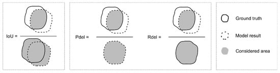 29], who analyzed the relationship between the areas of the bounding boxes of the inferred, the reference segments, and their intersections. The modification proposed in relation to the work mentioned is that the delimiting masks themselves were considered instead of the bounding boxes. Pdel is obtained by the ratio between the intersection area of each corresponding pair and the area of the inferred mask; Rdel is obtained by the ratio of the intersection area over the reference mask; F1-score_del is obtained by equation IV with the metrics Pdel and Rdel, respectively replacing Pdet and Rdet.