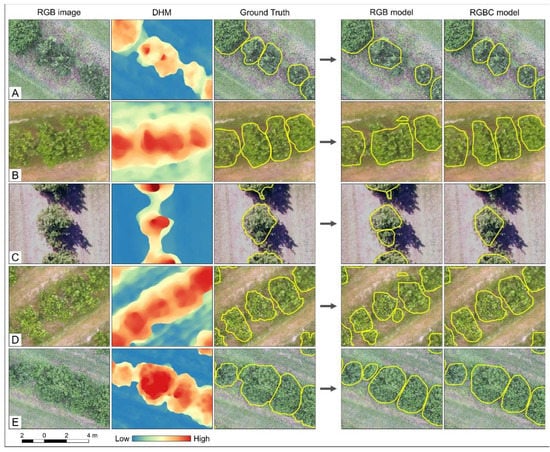 Therefore, the main contributions of the proposed approach in this study are: (1) the effort reduction for the elaboration of the ground truth and of the training samples; (2) proposal of a model to identify and delimit dense tree canopies in images of different characteristics with high accurate results (Detection: Overall accuracy and F1-score 97.01% and 98.48%, respectively, and design: IoU > 0.5 average of 0.848 and average F1-score of 91.6%); (3) development of a methodology to encapsulate all procedures adopted, reducing the need for manual operation.