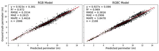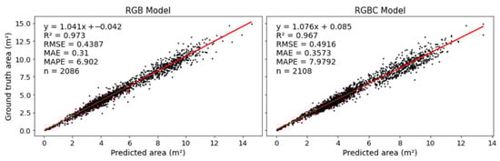 A regression analysis was performed to evaluate the relation between area and perimeter of the reference canopies and those estimated by the proposed method. For each analysis, the coefficient of determination (R2) was computed, which indicates the degree of correlation between the two variables, the Root Mean Squared Error (RMSE), the Mean Absolute Error (MAE) and the Mean Absolute Percent Error (MAPE). The higher the R2, the greater the correlation between the variables and the lower the RMSE, MAE, and MAPE, the closer. The four metrics were used for the analysis.
