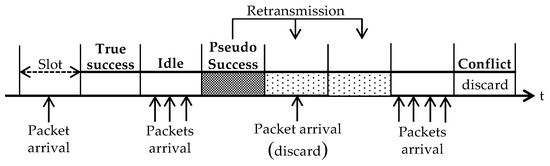 Figure 2 intuitively shows all slot states of the system. A gray grid indicates an active user that has a packet to send, while colorless grids refer to those users that have no packet to send. Obviously, if the number of gray grids in a slot is more than one, this slot will collide. If a user’s packet can be correctly received, the user will be free at the beginning of the next slot and send a newly arrived packet with the probability , so is the probability that a packet is sent for the first time. If a user’s packet conflicts, the user is backlogged at the beginning of the next slot and retransmits a replica of this conflicting packet with the probability , so is the probability that a packet is retransmitted.