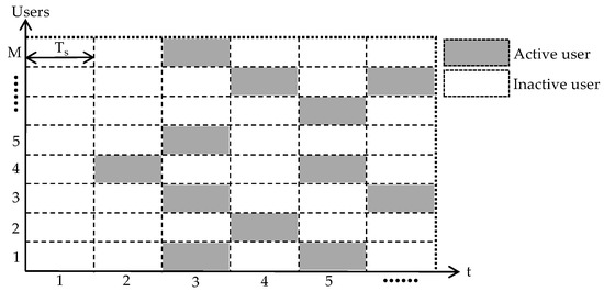 To analyze the protocol accurately, a frameless slotted-ALOHA system with active users is establish based on the elaboration of the protocol principle and the parameter setting in Section 2. Set the length of each slot as . At the beginning of a slot, active users try to send their packets to a common receiver. It is assumed that whether each user has a packet to send in a slot is independent. According to the slotted-ALOHA protocol, active users can only send their packets synchronously at the beginning of a slot. All active users in the system are either free or backlogged.