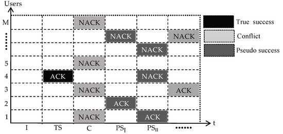 According to the slot state of the frameless slotted-ALOHA system in Figure 2, at any given slot, all states of the system can be divided into four cases: Idle (I), True Success (TS), Conflict (C) and Pseudo Success (PS). To facilitate understanding, Figure 3 shows the feedback of the receiver based on the slot state given in Figure 2. In different cases, the receiver will give different responses.