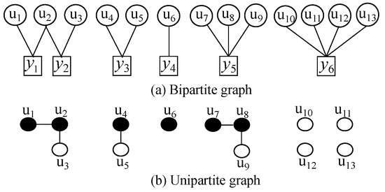 The system can be represented by a bipartite graph in Figure 5a, where the set of user node represents the packet sent by active users. The set of slot node indicates all packets received by a common receiver in slot . The line between user node and slot node indicates that is one of the packets received in . In order to display the user status intuitively, the system is represented by a unipartite graph, as shown in Figure 5b. Although a black node indicates that the user is free, a white node represents that the user is backlogged. The connection between two nodes indicates that the receiver has received the packets involving the two users. A group of connected packets is an element, such as and . There can be only one white node in each element. Once the receiver obtains a replica, the black node in this element turns white immediately.