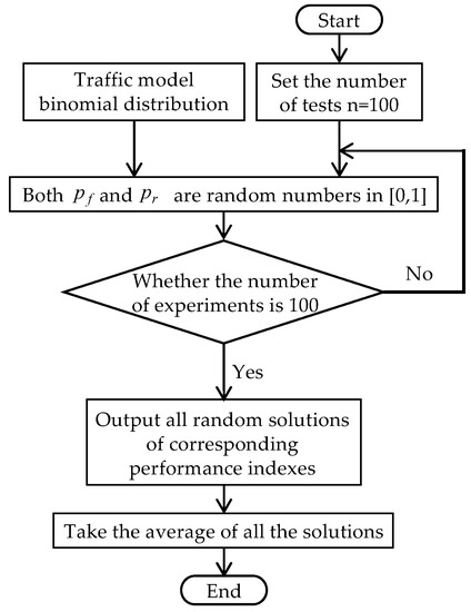 To prove the availability of the analysis results, we set the number of all active users in the system to 10, 20, 30 and 40, respectively. We regard the throughput performance as a function of the first transmission probability based on its definition in Section 4.1. Then, the retransmission probability is optimized for any given . It is found that the throughput achieves the best performance when is 0.09. After this, a stochastic simulation is made according to the binomial distribution probability model and state transition matrix. The ranges of and are set from 0.01 to 1 and from 0.001 to 1, respectively. The Monte-Carlo simulation procedure can be seen in Figure 7.