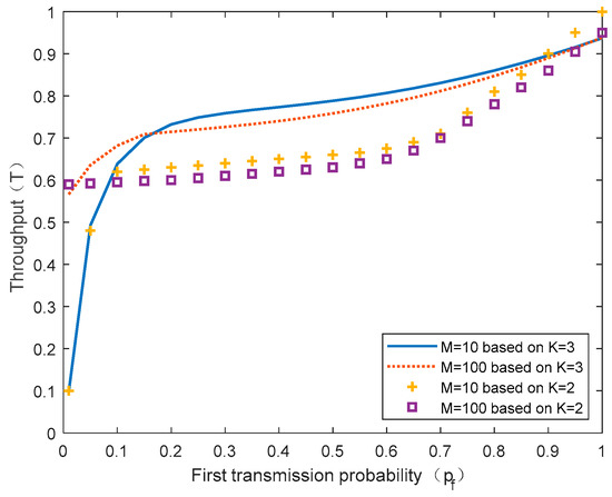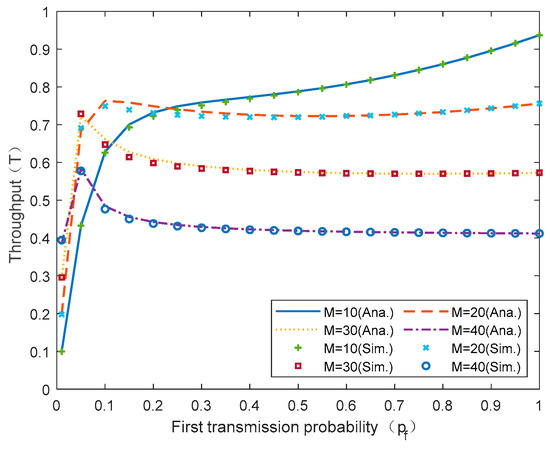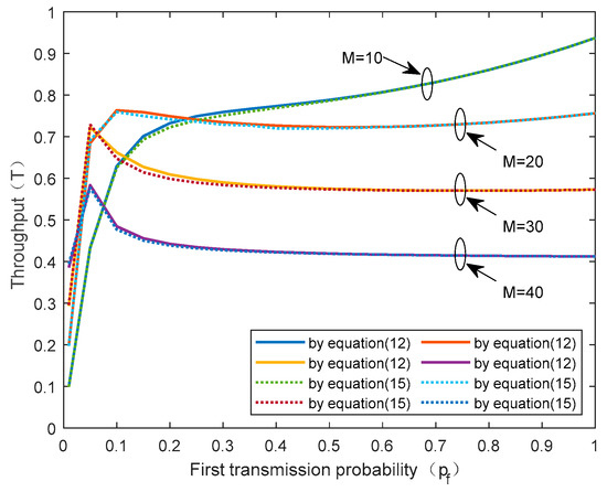 Figure 8 and Figure 9 illustrate the trend of the system throughput with respect to the first transmission probability. According to Equations (12) and (15) in Section 4.1, we verified the consistency for the two definitions of throughput through numerical calculation, which is shown in Figure 8. To further verify the availability of the numerical results, Figure 9 demonstrates the comparison between the numerical results and the simulation results. We can see that under heavy load, i.e., , the throughput gradually decreases as increases.