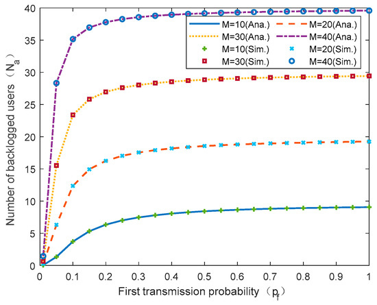 Number of backlogged users vs. first transmission probability (Ana. vs. Sim.).