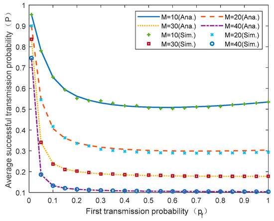 The expected successful transmission probability of a transmitted packet is shown in Figure 11. The simulation results reveal good agreement with theoretical results. Reference [11] only derives an expression for the successful transmission probability of packets and does not represent the numerical simulation results. However, we not only present the theoretical analytical expression, i.e., Equation (20), but also show the simulation results for validation. We can see that a higher probability of successful transmission can be achieved with a smaller . Hence, the solution for maximizing agrees with maximizing .