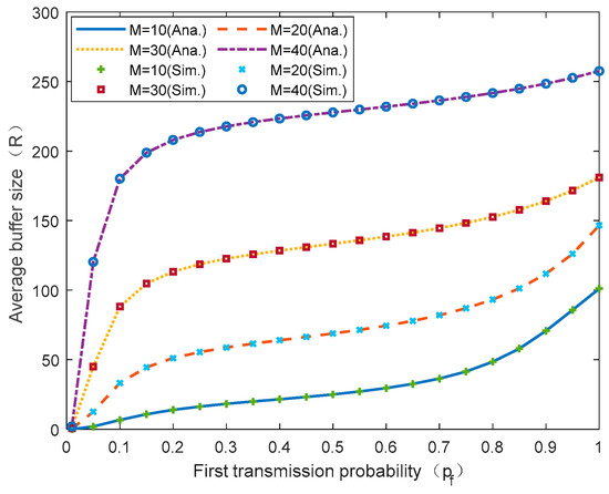 Figure 12 shows the average buffer size of the proposed protocol on the basis of Equation (19). The simulation results illustrate that the average buffer size increases with , and increases. When is below a certain value, e.g., , the rate at which the average buffer size increases is related to the number of active users. That is, the greater the number of active users, the faster the buffer size increases.