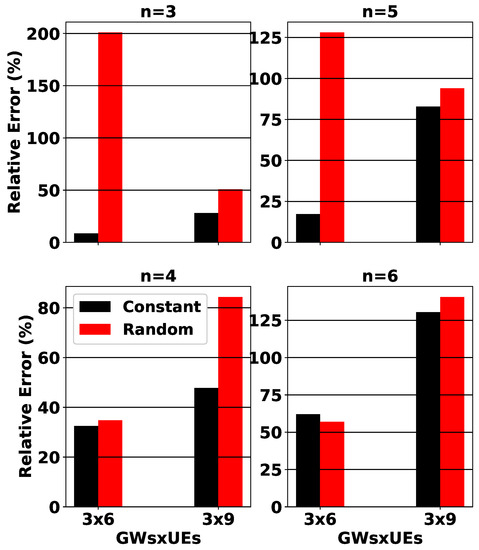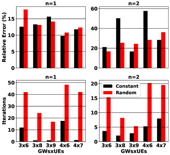 For the average relative error, a useful performance indicator is the maximum among the minimum relative errors through the different GWs–UEs configurations. Considering the 1st and 2nd order RM in Figure 1, this is about 14% for the 3 × 9 and 28.4% for the 4 × 6 GWsxUEs configurations, respectively, while the iterative proposed process has fast convergence, as shown from the average iterations of Algorithm 1 that are low. In case of HTS systems, with a larger number of GWs/UEs where a pairing allocation decision has to be completed in short time, it is practical to use an additional termination criterion with the maximum number of iterations in Algorithm 1.