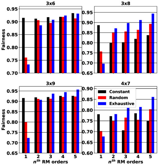 - Simulations have also depicted that pairings originated by greater than order RM lead to generally more UEs’ fairness, assuming the rate matchings between the UEs. Particularly, as we observe in Figure 1 and Figure 2, even a slight increase from to leads to much more fair UE pairings, and in this case, our practical approach can be fast implemented, resulting in a small relative error compared to the time-consuming exhaustive mechanism, as discussed in Section 3. The increment of fairness with increment in n is explained by the focus to the minimization of larger absolute differences of OCs and RCs in the minimization of rate matching as n becomes larger. This observation, based on the simulations, is of utmost importance for the satellite and generally wireless systems’ operators, because n can be used as a fairness controller for the rate-matching problem that has been used widely in the literature.