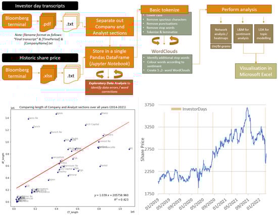 Top: Flowchart of text analysis for keyword extraction, sentiment analysis, and network building from the investor transcripts. Bottom Left: Comparing the length of Company and Analyst sections overall years (2014–2021). Bottom Right: A smaller sample of Admiral Share Price fluctuations with Investor-Day dates.
