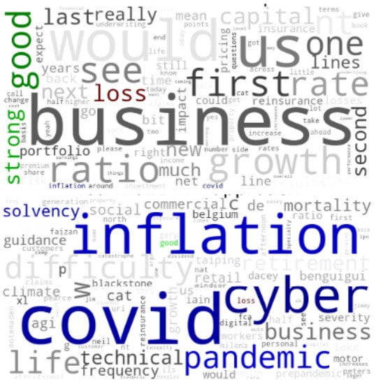Firstly, NLP approaches might help identify emerging market issues: Some risks such as the increase in cyber-crime can hit the headlines and are relatively easy to be identified by humans engaging in knowledge search through information platforms [5]. For this reason, many studies about market fluctuations have focused on social/news media analysis to predict financial patterns, like shocks in stock prices [6,7,8]. Other topics might give rise to niche or underground debates, e.g., health practice [9,10]: These topics might be more uncommonly discussed across media channels and thus become more difficult to be identified by monitoring social/news systems [10]. In this regard, NLP approaches enhanced by cognitive science [11] might help identify market perceptions towards the insurance sector. Understanding “the market’s” view of an insurer or the sector is important in judging to what extent investors are willing to provide additional funding following an adverse event [2,12]. This view can be reconstructed by considering mostly two elements [13,14,15]: (i) the semantic content describing specific features of the view (e.g., identify disgruntled market analysts), and (ii) the affective content brought by these features (e.g., protesting inspiring negative feelings). In computer science, positive or negative attitudes are mapped within the idea of “sentiment” [7,16], which broadly overlaps with “valence” in psychology [15,17], i.e., how pleasantly or unpleasantly a concept is perceived. In this paper, sentiment and valence will be used as synonyms, like in previous works [17,18,19]. A persistent negative sentiment could concern supervisors [20], as it suggests an increase in the risk that investors may no longer support a financially weak insurer. In a banking context, Gandhi & colleagues [21] identified that more negative sentiment scores are associated with larger de-listing probabilities, lower odds of paying subsequent dividends, and higher subsequent loan loss provisions. By combining keyword extraction, sentiment analysis and network science, can NLP techniques unveil the key themes and sentiment patterns that would help insurance supervisors prioritise areas of focus? For instance, can such techniques help supervisory decisions on whether to prioritise more time on understanding cyber-attacks, inflation, or climate change-related issues? A second element of relevance to this study is the identification of risk-profile similarities across different insurers. Understanding what insurers talk about in their reports is important to supervisors, as such knowledge can identify what events that insurer has faced or is going to face in the future [2,3]. For example, a motor insurer is exposed to a severe winter potentially resulting in a significant increase in car accidents; in contrast, a satellite insurer will be exposed to possible electrical failures on launch. In practice, supervisors, in making judgments, group and benchmark their firm against those they believe have a similar risk profile [22]. Such groupings are based on a mixture of quantitative and qualitative factors. Can NLP provide a systematic, unbiased perspective identifying similar ways in which insurers discuss risk-related events, based on textual data alone as communicated and recorded in investor day transcripts?