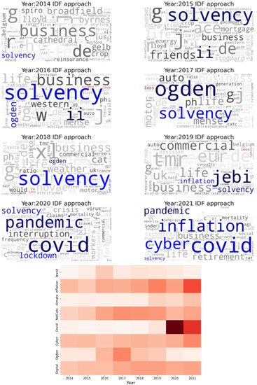 Uni-gram word clouds based on the TF-IDF weightings highlight interesting patterns from the data, which are reported in Figure 3, top. “Solvency” was strongly featured in the years 2015–2017. This coincides with the introduction of a new complex prudential regulatory framework in the EU, known as Solvency II (https://www.eiopa.europa.eu/browse/solvency-2_en, last accessed: 14 September 2022). “Ogden” was prominent in 2016 and even more in 2017. This was a material issue for UK motor insurers, reflecting a significant increase in the number of court awards following a severe bodily injury claim (https://www.insurance2day.co.uk/ogden-rate-discount-rate/, last accessed: 14 September 2022). “Jebi” was a Japanese typhoon that occurred in December 2019 resulting in an estimated USD 13.5 billion. Its prominence reflects the timing (i.e., at the end of the year) and the uncertainty in total insured losses. COVID-19 and national lockdowns [19] were all unsurprisingly featured heavily in 2020. In 2021, in addition to the COVID-19-related topics, “cyber” and “inflation” became more prominent (according to the TF-IDF algorithm). In part, this relates to the tensions leading to the Russia-Ukraine conflict, especially since the year-end reporting for at least some of these firms occurred after the start of the war. These patterns indicate that the TF-IDF scores were able to identify notable events that influenced risks in the insurance sector, and hence of relevance to prudential regulators.