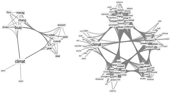 Semantic frame network analysis provides a further enhancement to uni-gram analysis since network links can identify how concepts were associated in insurance reports. Reporting all network neighbourhoods/frames for all the roughly 3000 unique words represented as nodes in each yearly network would be cumbersome. Hence, we focused our attention on concepts that underwent the most drastic transitions in their semantic frame size, i.e., the number of words linked to them. The most drastic fluctuation was found to be relative to “climate”, which underwent a massive increase in semantic frame size k between 2018 () and 2020 (), an increase of 538%. The semantic frames for “climate” over these two years are reported in Figure 4. These conceptual associations highlight how the context of “climat” mentioned in IDTs has evolved and increased in recent years, particularly with the appearance of more conceptual associations linking climate change with the health emergency and the costs of developing a resilient infrastructure. Interestingly, in 2018, the IDTs framed “climate” as a concept with a rather narrow semantic frame, mentioning links with “business”, “volatility” and “management”. In 2020, the topic matured in 2020 to include crucial associations, that led to a more densely structured semantic frame, with several concepts revolving around the climate transition, its economic benefits and costs, and the need for resilience against crises, like COVID-19.