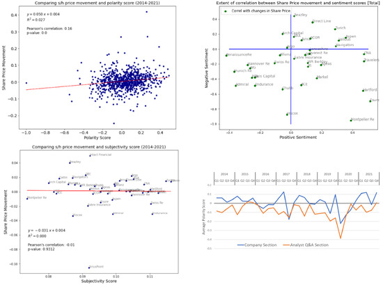 Figure 5, bottom left, considers the interplay between the subjectivity expressed by companies in insurance reports and the relative share price movements. According to previous works, [28], subjectivity should reflect anticipation of the future related to economic growth. Do companies providing more subjective content, and hence possibly providing more aspirational messages, benefit from higher share prices? The data displays a negative answer: There is a lack of statistically significant correlation (Pearson’s ) between subjectivity scores in reports and share price movements. This negative finding indicates that the insurance market debated in the current dataset is portrayed as focused on the present, with statements that do not focus on the expectation of future growth.
